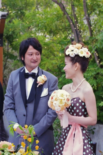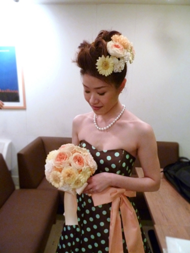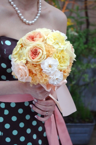 Ayamelliaプロフェッショナルメンバー金原史枝さん『友人に依頼されウエディングブーケを作りました。打ち合わせをし、茶と水色のドットドレスがキュートでしたので、テーマはお菓子のようなブーケ と決まりました。アヤメリアシュシュローズでコロンとしたマカロンのようなお花を作り、甘くておいしそうなブーケが出来ました。想像以上のブーケだと喜んでもらえたので、花をやってきてよかったです。』